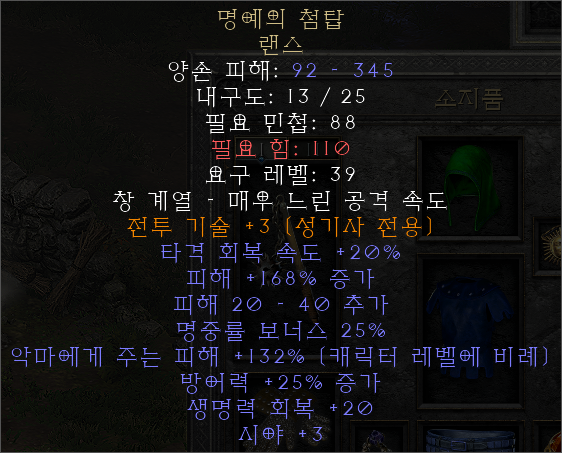 명예의 첨탑 랜스 유니크 아이템은 저레벨 구간에서 활용하기 좋으며, 익셉셔널 등급이기 때문에 엘리트 등급으로 업그레이드가 가능하다. 피해 200%가 으뜸이며, 악마에게 주는 피해 대미지와 명중률 보너스 등 여러가지 대미지에 좋은 옵션들이 갖춰져 있다.