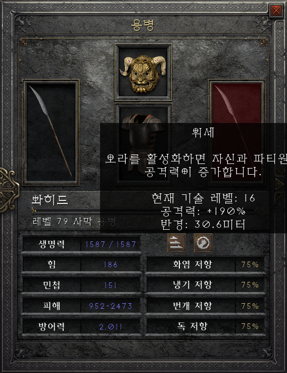 용병 옵션도 매우 중요합니다. 어차피 마나수급은 통찰 무기로 만드는 강철 골렘(아이언골렘/아골)을 소환하게 됩니다. 따라서, 용병은 오라 버프를 줄 수 있게 세팅하면 되는데, 악몽 난이도의 마이트 용병(액트 2)을 고용해주고, 무기는 긍지(자존심)을 만들어서 착용해줍니다. 혹은 시폭을 자주 사용하는 경우에는 무한의 공간(무공)을 만들어 착용해줍니다. 선택사항입니다.