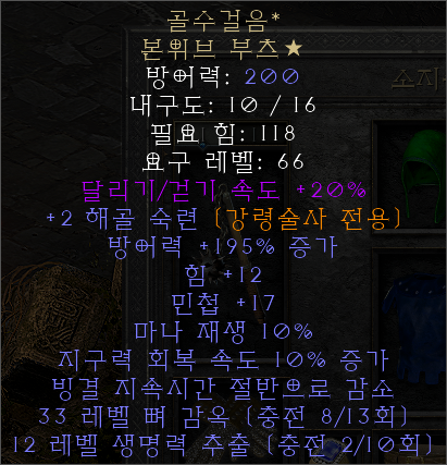 - 신발의 경우 : 골수걸음 본위브 부츠를 착용합니다. (+2 해골 숙련)
