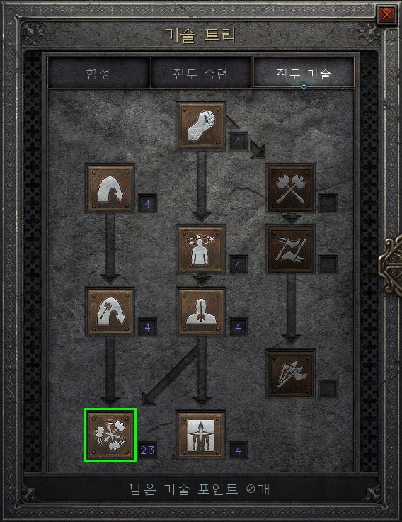 전투 기술의 경우에는 소용돌이를 마스터하고 나머지 길목 스킬만 하나씩 찍어주면 됩니다. 광폭화(버서커)의 경우에는 1개는 찍어줘야 하는데, 그 이유는 물리 면역을 잡아주기 위해서입니다. 간혹 트라빈컬에서도 하나의 슈퍼 유니크 몬스터가 물리 면역을 달고 나오는 경우가 있습니다.