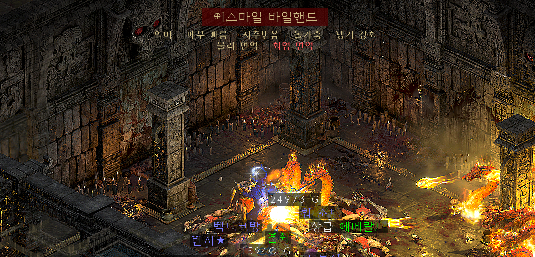괴물에게서 얻는 금화 증가와 생명력, 화염 피해까지 삥바바를 위한 반지라고 해도 무방할 만큼 완벽한 아이템입니다. 당연히 쌍으로 착용해줍니다. 트라빈컬의 히드라에게 대미지를 전혀 입지 않습니다. 반지는 고정입니다.