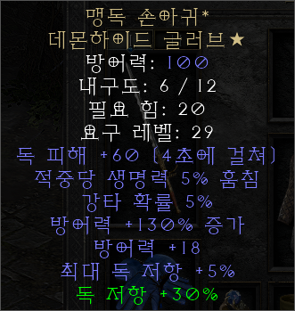맹독 손아귀 글러브, 흔히 말하는 강타장 아이템이며, 5%의 강타확률이 있다. 피흡의 경우도 5%가 있다. 독 저항을 크게 올려주는데, 장갑 부분의 경우에는 일반 사냥시 메이지 계열이라면 마수장갑 혹은 트랑장갑, 밀리계열이라면 안수장갑이 자리잡고 있으므로, 수요가 거의 없는 아이템이라고 할 수 있다.