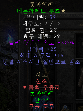 통과의례라는 이름이 멋진 세트아이템이다. 데몬하이드 부츠 세트 아이템으로, 데몬하이드 부츠의 경우 유니크만 사용한다. 데몬하이드 부츠는 지옥불걸음*이라는 아이템으로 삥바바가 선호하며, 변동옵션이 많아서 꼭 주워서 확인해야 하는 아이템이다. 그에 반해 데몬하이드 부츠 세트 아이템의 경우에는 볼 필요 없이 상점 혹은 버리는 아이템이다.