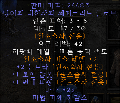 원소술사 기술 레벨의 경우에는 최대 2까지 붙을 수 있고, 별도의 스킬 옵션이 3까지 붙을 수 있다. 또한 위와 같이 마나와 함께 별도의 옵션이 붙을 수 있는데, 바로 시전 속도 +20%가 붙으면 딱 좋은 옵션이 되는 것이다.
