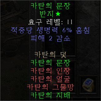 원소술사 전용 세트아이템인 것 같지만, 세트 아이템 구성이나 옵션을 보면 참 기가막힌 아이템이다. 요구 레벨은 11이며, 세트 반지 중에서 카탄의 문장이라는 아이템이 자주 나오는데, 세트 반지를 감별할 때 마다 카탄의 문장이 나오면 욕을 하게 되는 아이템이다.