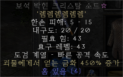소켓 아이템 중에 크리스탈 소드의 경우에는 다양하게 활용할 수 있는데 4소켓이라면 룬워드 영혼 재료로, 5소켓이라면 소집*콜투암스 재료로 6소켓이라면 룬워드 대신 렘 룬을 6개 박아 금화 %를 엄청나게 증가시킬 수 있다. 삥바바 스왑무기로 사용하며 각각 쌍으로 사용해야 하기 때문에 렘 룬이 총 12개가 필요하다.