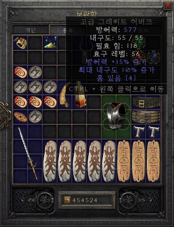 4소켓 고급 그레이트 허버크를 주웠다. 방어력 +15% 으뜸 옵션과 최대 내구도 10% 증가가 붙었다. 내구도의 경우에는 15%가 아니라면 무옵으로 친다. 오히려 잡옵이라 해서 가치가 하락하는 원인이 되기도 한다. 다만, 내구도가 10%으로 딱 떨어지게 옵션이 나왔기 때문에 꽤 괜찮은 룬워드 재료라고 생각이 되는데, 문제는 이걸로 뭘 만들면 좋을 지다.