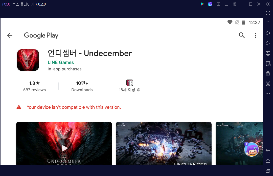 먼저 녹스로 구글 계정 로그인을 한 후 구글 플레이 스토어에서 언디셈버를 검색하거나 인터넷 버튼을 클릭해서 언디셈버 설치 링크를 복사 붙여넣기 합니다. 만약, 위와 같이 버전이 맞지 않다면 호환되지 않기 때문에 멀티 앱플레이어를 통해서 새로운 녹스 앱플레이어를 설치해야합니다.