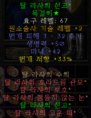 탈 라샤의 선고, 일명 탈목. 탈라샤 세트 중에서 갑옷 다음으로 잘 안나오는 아이템이며, 기본 성능 또한 우수하기 때문에 마라 목걸이 이전에 얻는다면 적당히 사용하기 좋은 아이템이다. 세트 아이템으로 장착하면 더욱 좋다. 직접 얻었으며, 헬 난이도 액트 1 안다리엘 주변의 잡몹에게 얻었다. 목걸이를 잘 준다는 안다리엘에게 얻은 것은 아니지만, 안다리엘 주변의 몹에게 얻었다.
