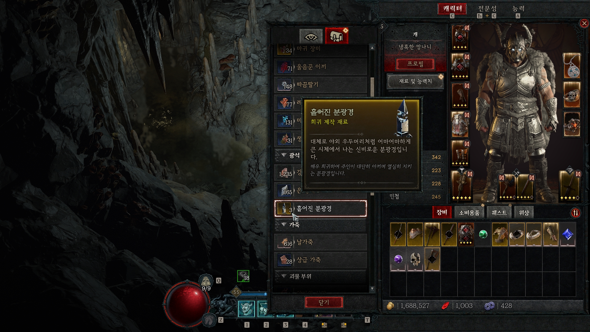 장비에 소켓이 없는 경우, 마을의 보석공에게 가면 흩어진 분광경을 사용하여 장비에 소켓을 만들 수 있습니다. 또한, 고행에서 우두머리급 필드보스를 처치하면 흩어진 분광경을 자주 획득할 수 있습니다.