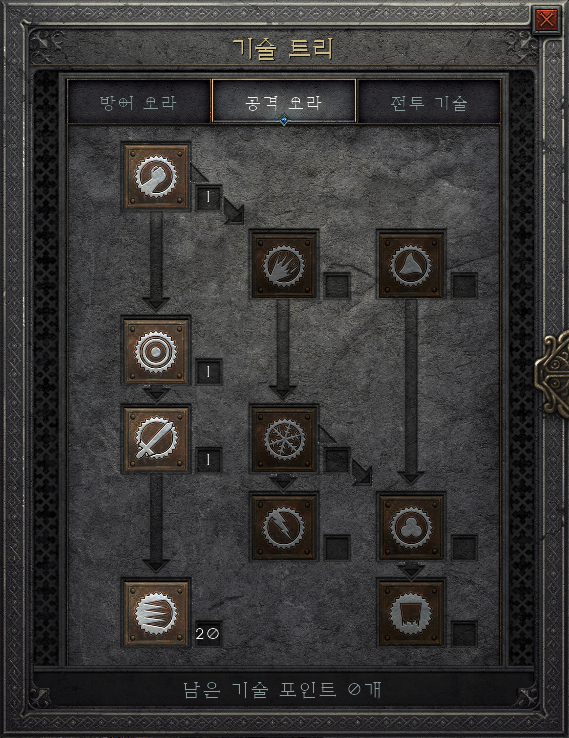 공격 오라에서는 광신(파나틱시즘)을 키고 강타(스마이트)를 합니다. 따라서, 길목 스킬을 하나씩 찍어주고 광신을 마스터합니다. 전투기술에서는 강타(스마이트)를 마스터하고, 높은 방어력과 블럭률을 위한 신성한 방패(홀리 쉴드)를 마스터해주면 됩니다.