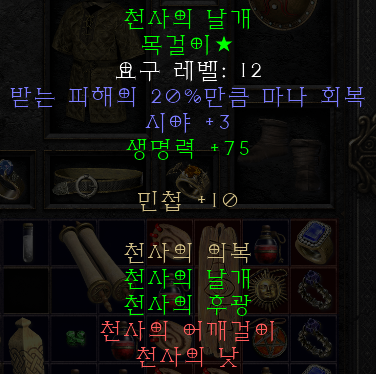 시버브의 곤봉과 천사의 후광 반지, 천사의 날개 목걸이는 필수라고 생각됩니다. 그 다음 요구 레벨 15에 착용할 수 있는 크톤의 발 보호대 체인부츠 유니크 아이템도 필수입니다. 시곤 벨트나 극지 아이템 세트도 있으면 좋습니다.