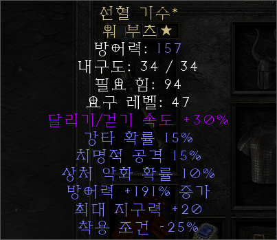 선혈 기수 워부츠 입니다. 선혈 기수가 없다면 고블린 발가락 부츠(강타 확률 25%)를 착용해도 됩니다. 선혈 기수는 강타 확률이 10% 빠지는 대신, 치명적 공격과 상처 악화 확률을 각각 15%, 10% 챙길 수 있습니다.