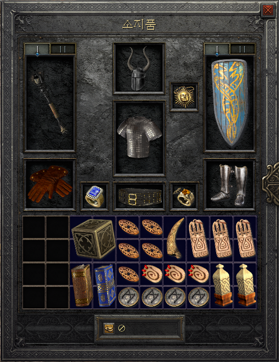질딘으로 육성했을 때의 아이템 세팅 모습입니다. 이 상태에서 몇 가지 아이템만 변경하면 됩니다. 먼저, 무기의 경우에는 고뇌나 마소를 준비해주면 더욱 좋겠지만, 어디까지나 횃불 퀘스트용으로 육성한 성기사이기 때문에 많은 투자는 부담스러울 수 밖에 없습니다.