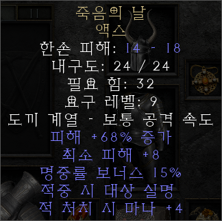 요구 레벨 9에 착용할 수 있는 죽음의 날 액스는 초반 마나 수급을 원활하게 해 준다.